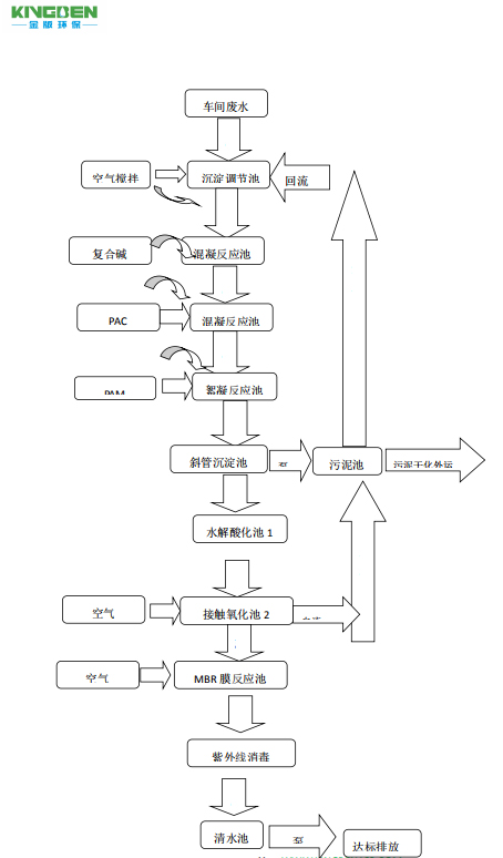 最后,再針對廢水水質(zhì)、水量特點,結(jié)合小試分析,擬的工藝流程如下圖: